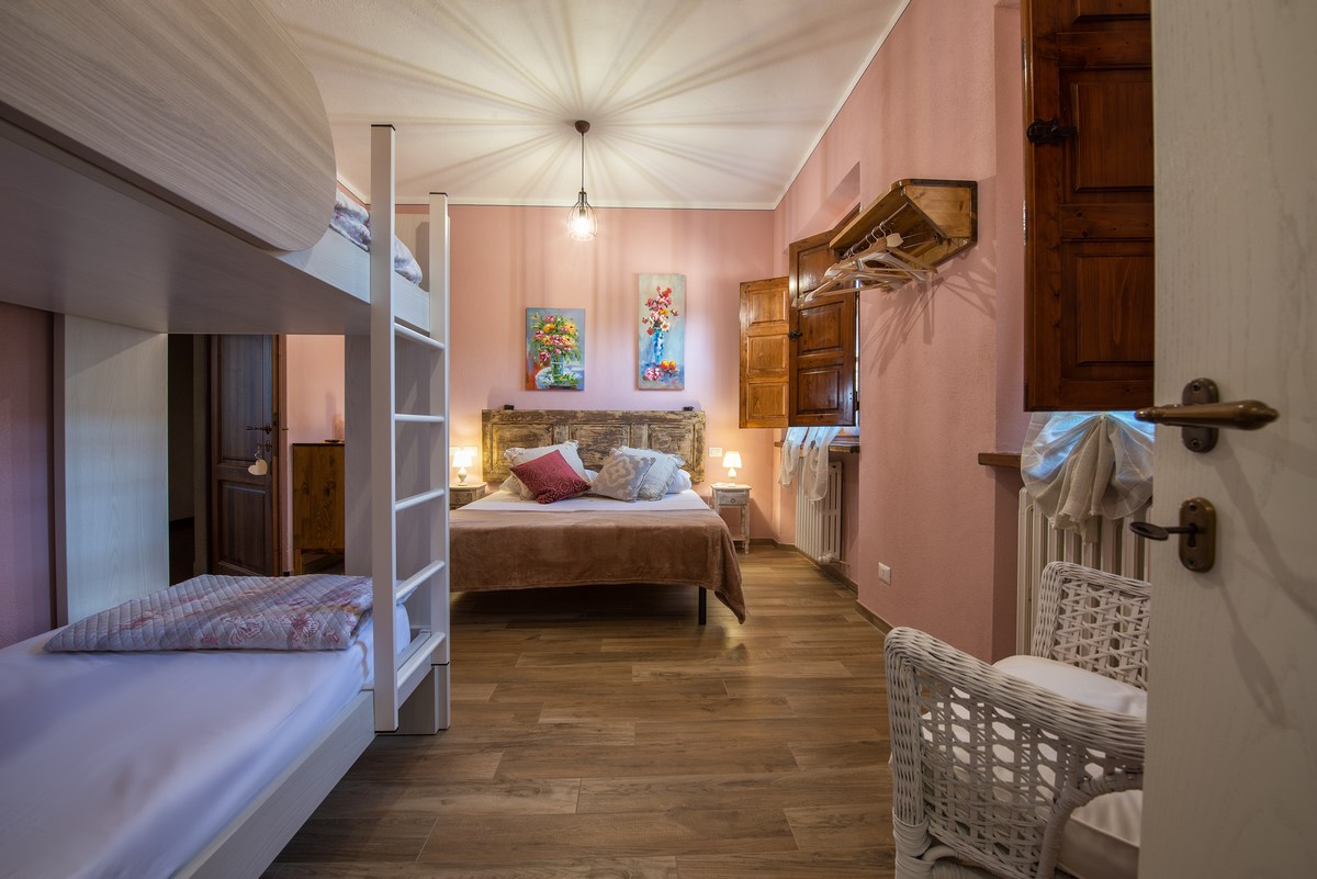 Corbezzolo è una grande camera confortevole arredata con gusto. E' dotata di 4 posti letto (2 a castello), di un cassettone, di una poltrona e di una cassaforte con codice digitale. Il bagno è molto ampio e permette agli ospiti di muoversi e rilassarsi liberamente. La doccia è molto spaziosa.
